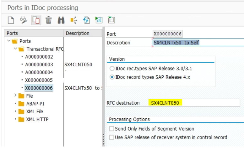 Tcode: WE21. Before creating the Partner Profiles, you need to define a Port that will be used by the Outbound Idoc. In this case, the Port needs to be pointing to an RFC for the same Client that you are in. In my case SX4CLNT050. By doing this, you will trick the system to send the Idoc to a Port that it is also within the same system (go out, to come back in within itself). This is the KEY part of this whole Solution to make it work.